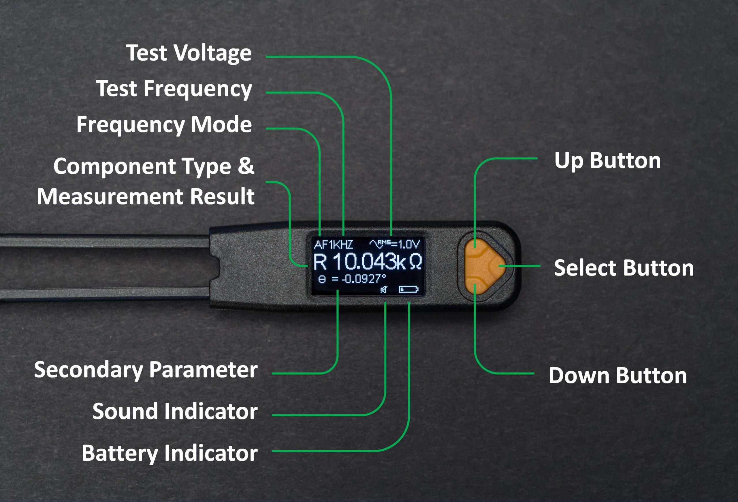 LCR Pro1 is full of handy shortcuts to help you switch all kinds of parameters faster and easier. During measurements, you can quickly select different settings by single clicking, double clicking or holding the navigation button.