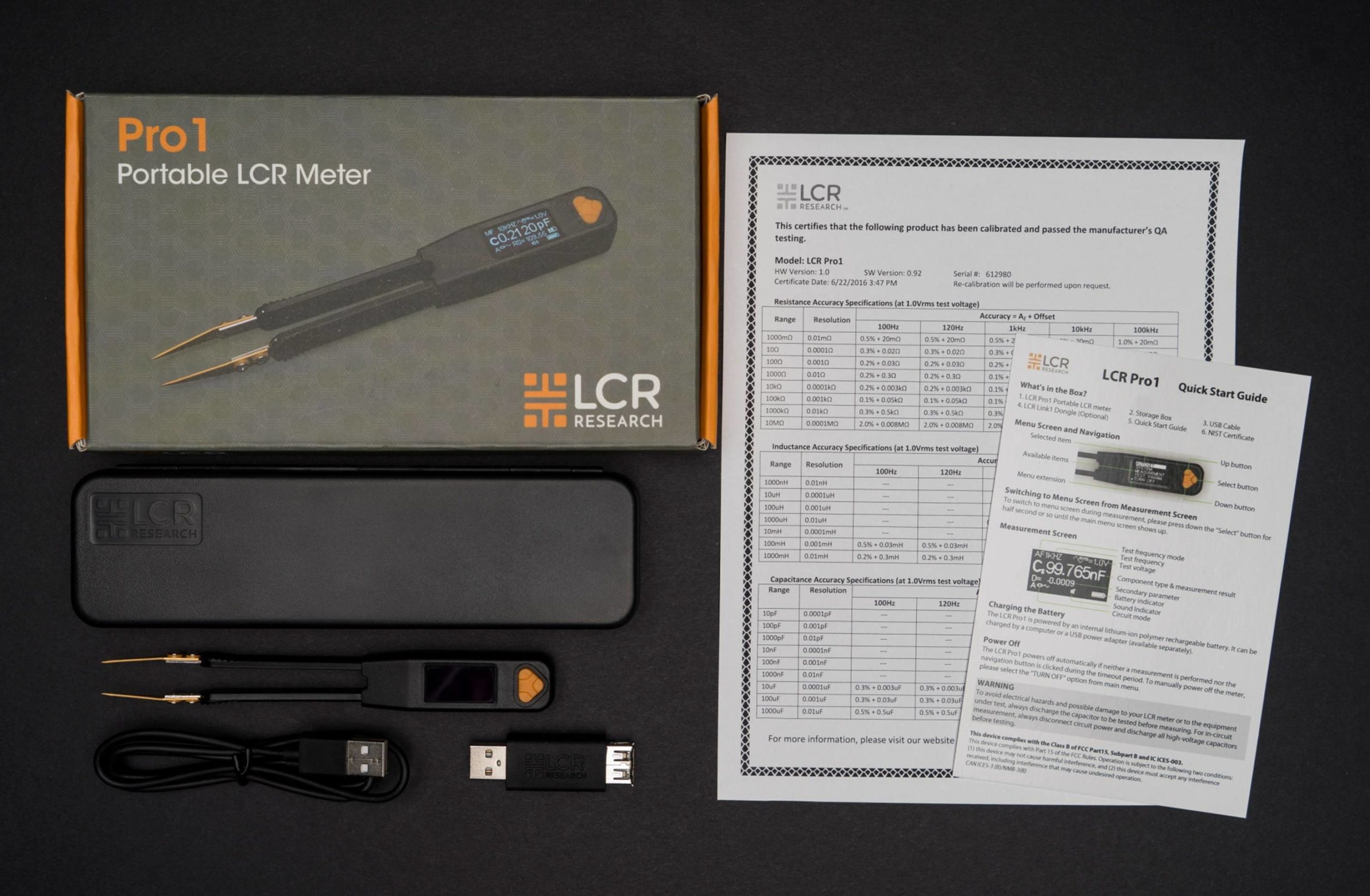 LCR Pro1 delivers high accuracy once found only in high-end desktop LCR meters. It provides basic accuracy 0.1% for resistance and 0.2% for capacitance and inductance with 5-digit resolution. Each device is fully calibrated during production and shipped with NIST (National Institute of Standards and Technology) traceable calibration certificate.