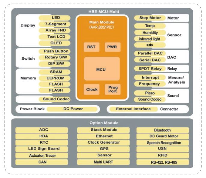 MCU products based on 8-bits is the basic training theme that is being used on education sites for a long time. However, when it is a product manufactured to fit into traditional training method, a cramming one, it is impossible to configure its capabilities in the way users want, This product is a micro embedded training system designed to support variety of MCUs and, based on that, realize independent modularity of each function for the purpose of quickly applying the multiform program lessons including the basic training and meeting user’s requirements to effectively apply the creativity engineering training recently emerging from universities and high schools to education.