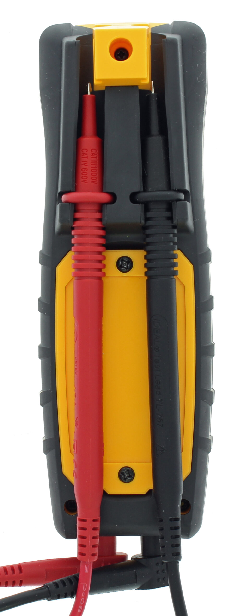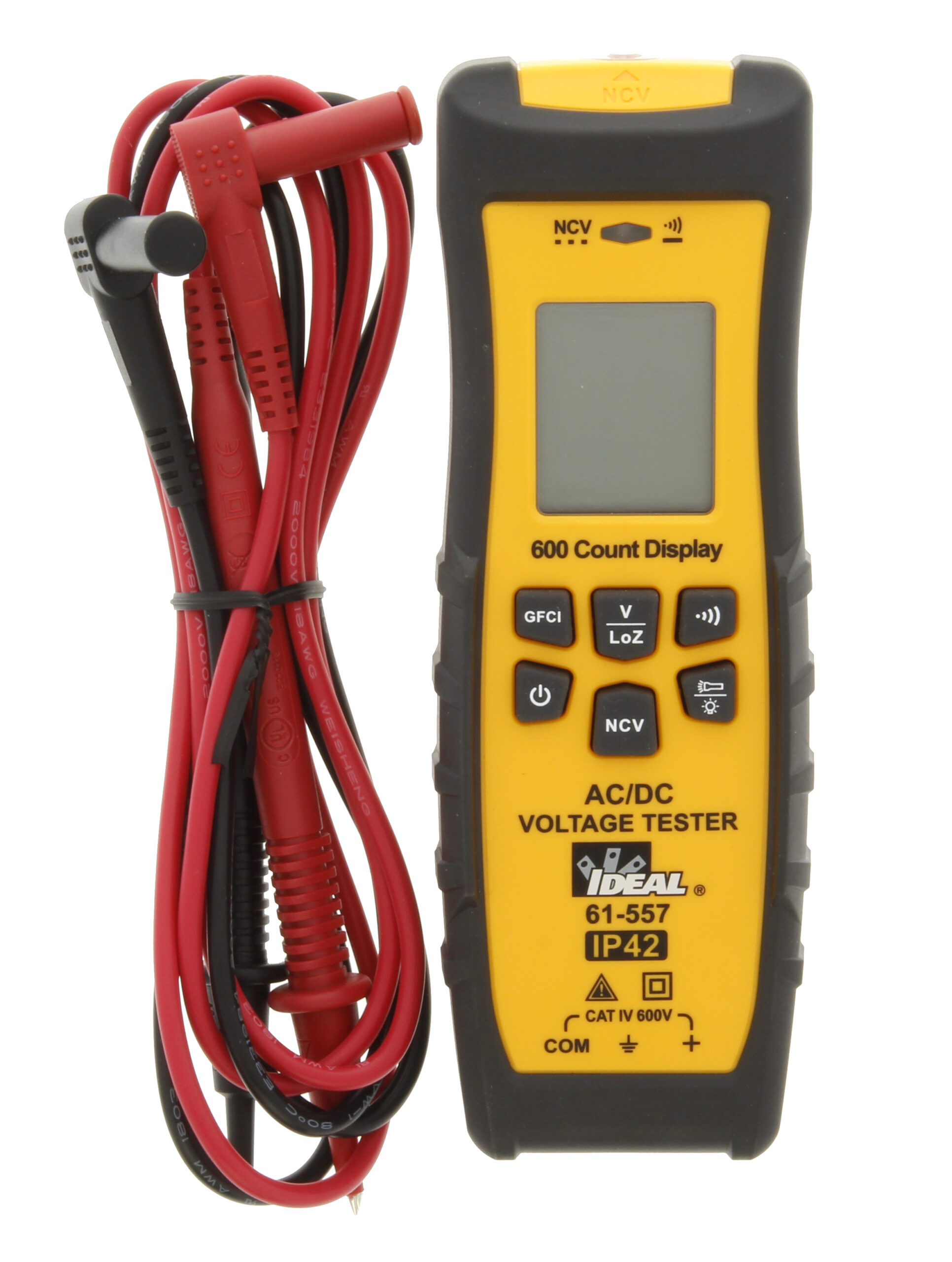 IDEAL 61-557 Voltaj Süreklilik Test Cihazı, AC ve DC voltajını, Düşük Empedanslı AC Voltajını (Lo Z) ölçen (yanlış okuma olasılığını azaltmak için) CAT IV 600 V dereceli bir otomatik aralıklı ortalama karekök (ARMS) dijital metredir. hayalet gerilimlere) ve süreklilik, test uçları aracılığıyla. Sayacın üst ortasındaki temassız bir sensör aracılığıyla 90V ila 600V AC arasında voltaj varlığını algılar ve problar ve test düğmesi aracılığıyla bir GFCI açma testi gerçekleştirebilir. Metre, arkadan aydınlatmalı bir LCD ekrana ve zayıf veya sıfır aydınlatma koşullarında çalışırken aydınlatılabilen dahili bir el fenerine sahiptir. Ünite, voltajın 36V AC / 50V DC’nin üzerinde olduğunu, sürekliliğin algılandığını ve NCV voltajın ayarlanan aralık içinde olduğunu algıladığını bildirmek için ölçüm cihazının ortasında yanan kırmızı bir LED ve sesli uyarılar kullanır. Ölçüm cihazının arkasında yerleşik iki konumlu ikili prob tutucu bulunur; alt konum, probun saklanmasına izin verir, daha yüksek konum, ölçüm cihazının ve sabitlenmiş probun bir elde ve diğer elde probun tutulmasına veya test veya ölçüm yapılmasına veya çıkış testi yapılırken her iki probun uçta sabitlenmesine izin verir. Ölçüm cihazının, bir çiviye, vidaya veya manyetik bir yüzeye asılabilmesi için ölçüm cihazına bir askı bandının (ayrı olarak satılır) takılmasına izin veren bir askı askısı montajı vardır (bu özelliğe sahip diğer tüm IDEAL sayaçlarla uyumludur). Pro endüstriyel sınıf üst kalıp tasarımı, bu test cihazını tutmayı kolaylaştırır ve 2 m’den (6,5 ft) düşmeyi sürdürebilir. Bu sayaç, her Güç AÇIK’ta Kendi Kendini Test etme, Otomatik AC/DC voltajı ve DC polarite tespiti, düşük pil göstergesi, Otomatik Kapanma işlevi içerir ve 3 adet 1,5V AAA Pil ile birlikte gelir.